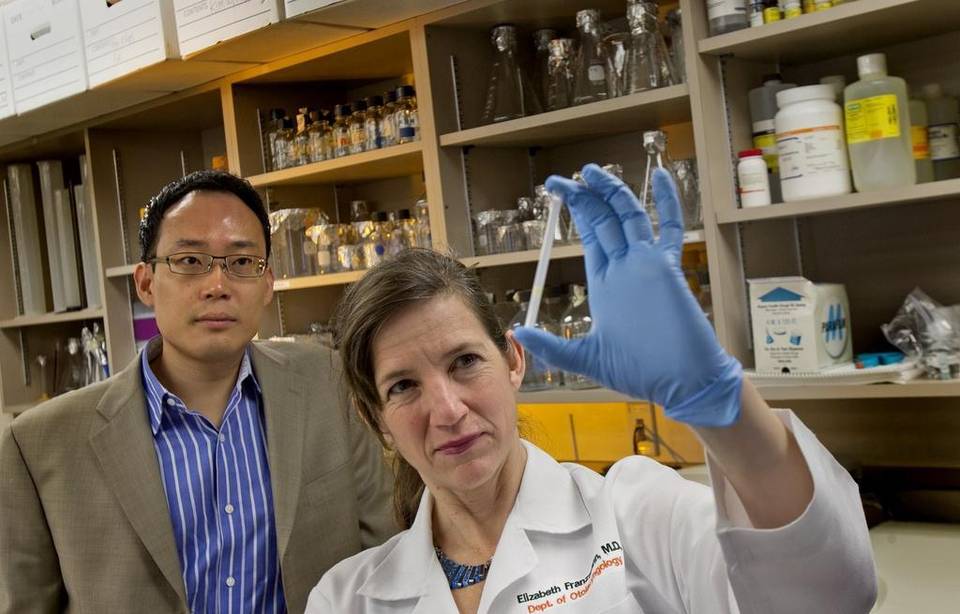 Matthew H.J. Kim, who founded Vigilant Biosciences, and serves as the company’s chairman and CEO, is shown with Dr. Elizabeth Franzmann, who is looking at a OncAlert point-of-care test prototype. Vigilant is working on an early detection system for risk of oral cancer. PATRICK FARRELL MIAMI HERALD STAFF